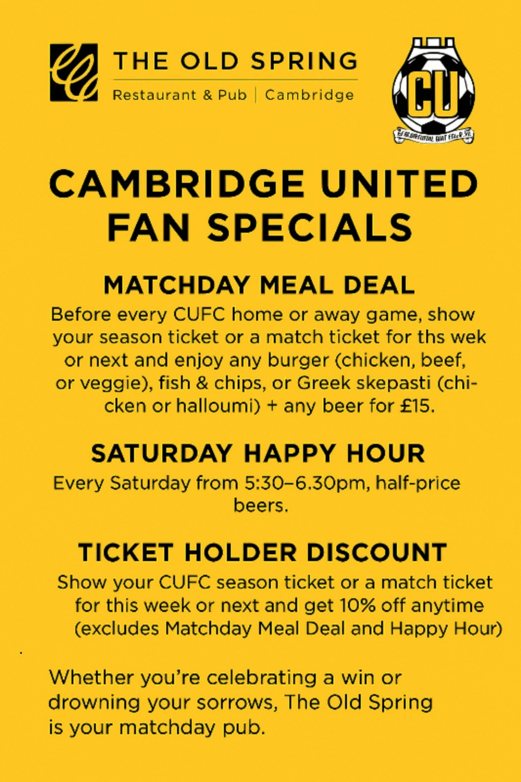 Ticket Holder Discount: 10% off your food and drink anytime, any day of the week, with a CUFC season ticket or a match ticket for an upcoming game (cannot be used alongside Matchday Meal Deal or Saturday Happy Hour).