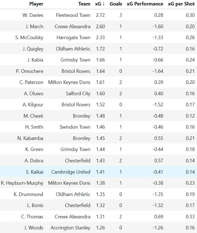 Fleetwood’s Will Davies ranks on top with 2.72 xG, and he’s finished his chances so far with 3 goals. Josh March is just below him but only opened up his account for the season on Tuesday. Kaikai breaks into the top 20 having 1.41 xG and 1 goal so far.