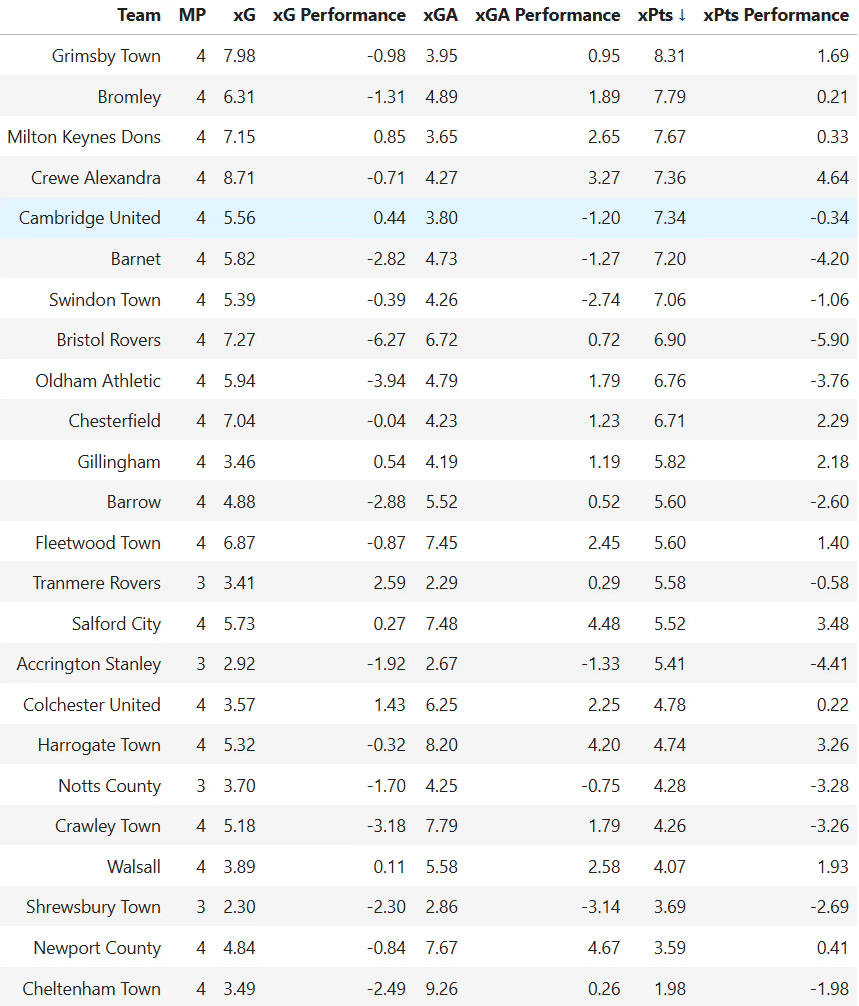 But enough about us (for now). Elsewhere on the table, our next opponents Bristol Rovers are the biggest under-performers so far. They have earned almost 6 points fewer than expected, largely because they simply cannot finish their chances. They have no problems creating chances, so let’s hope the floodgates don’t open for them on Saturday!